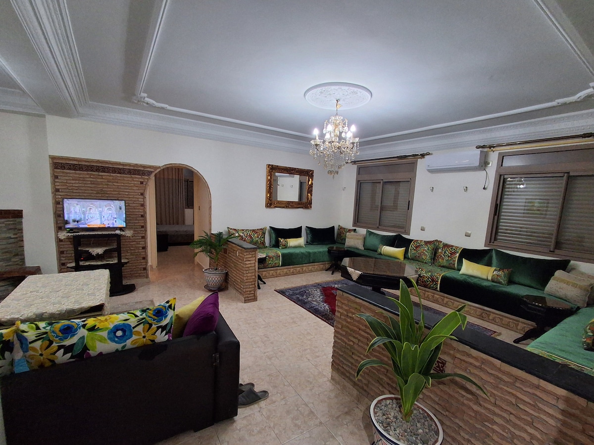 도시 중심의 조용한 지역에 위치한 150m2의 고급스러운 아파트를 제공합니다. 전통 분수가 있는 멋진 테라스에서 아름다운 전망을 감상할 수 있으며, 꽃 화분으로 둘러싸인 식탁에는 모로코 전통 타일로 장식되어 있습니다. 즐거운 시간을 보내고 햇살을 즐길 수 있는 곳입니다. 침실 2개, 현대적인 거실, 잘 갖춰진 주방(커피 머신, 가스레인지 등), 와이파이 연결, 65인치 TV를 갖추고 있습니다.