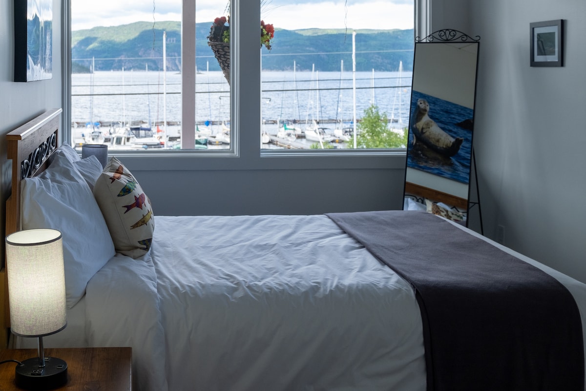 Fjord Appartement familiale 4 à 8 personnes Ce magnifique appartement qui surplombe le fjord peut accueillir plusieurs personnes, trois chambres séparées dont un lit king, deux grand lit Queen et canapé lit au salon, télévision, WI-FI. Cuisine complète avec lave-vaisselle, salle de bain avec double éviers, grande douche multijet. Profitez d’une magnifique terrasse privée , une aire de BBQ et un espace feu sur le terrain.Vue sur l’îlet, les montagnes le quai et de la marina.