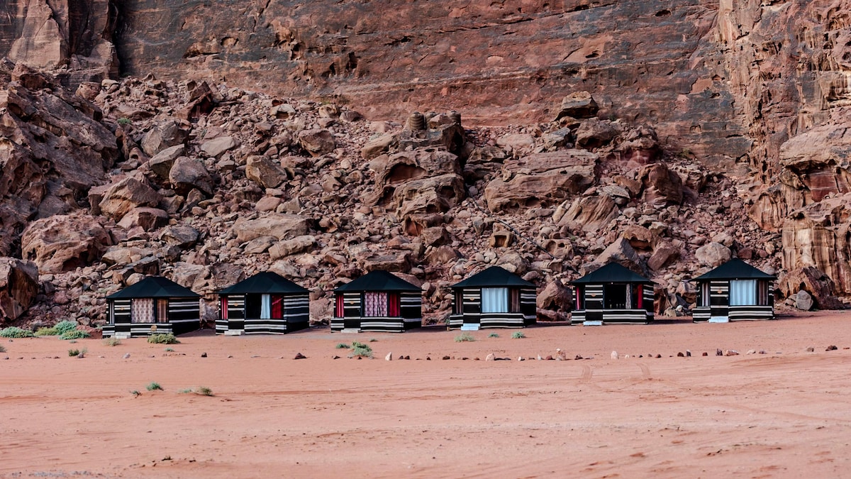 와디 럼 보호 구역 사막 한가운데에서 진정한 베두인족의 환대를 경험해보세요. 전용 욕실, 온수, 숨막히는 사막 전망을 갖춘 텐트. - 조식 뷔페는 요금에 포함되어 있습니다. - "제르브" 화덕과 함께하는 전통 베두인족 저녁 식사(1인당 10 JOD) - 프라이빗 4x4 지프 투어를 준비합니다. - 별빛 아래에서 잠을 잘 수 있는 숙소 - 낙타 산책, 샌드보딩 등 다양한 액티비티 - 사막 트레킹 - 저희 숙소는 태양 에너지를 사용해 환경적으로 지속 가능합니다.
