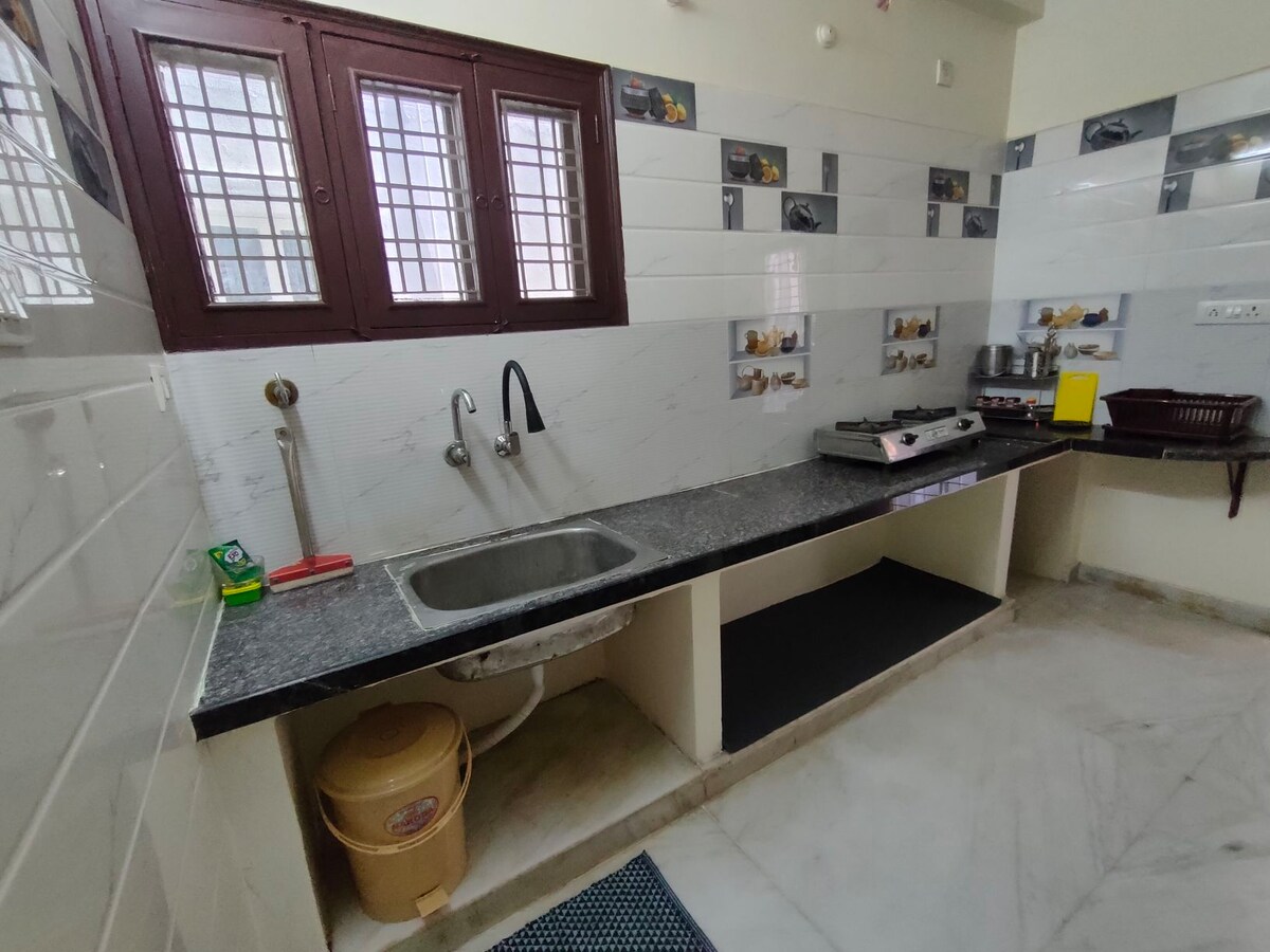 Relax in this cozy and well-maintained 1BHK house, ideal for couples, solo travellers, or business guests. The house includes a private bedroom, living area, fully equipped kitchen, and a clean bathroom. Enjoy air conditioning, high-speed Wi-Fi, fresh linens, and essential toiletries. Located in a peaceful area with easy access to transport, restaurants, and daily essentials. Perfect for short or long stays with comfort and privacy.