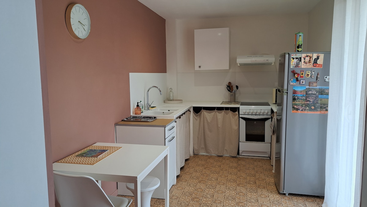 평화롭고 중심적인 공간에서 삶을 간소화하세요. 이상적인 위치에 있으며, 무료 주차장이 있는 70㎡ 규모의 복층 아파트는 완전히 개조되어 4명이 지낼 수 있습니다. 1층: 더블 작업 공간, 화장실, 주방과 거실이 있는 대형 거실 소파베드입니다. 식기세척기. 식료품 저장실에 세탁기가 있습니다. 화장실. 위층, 침실 2개(침대 1개 160, 침대 1개 140), 샤워기가 있는 샤워실.