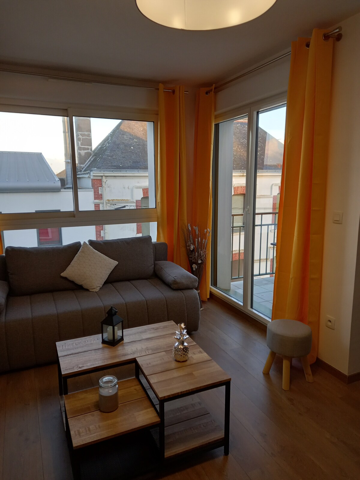 Appartement pour 2 à 4 personnes se situant au 2ème étage d'un immeuble récent et sécurisé avec ascenseur. Emplacement centre-ville et mer à pied. classé ***. le logement de 39 m2 se compose: hall d'entrée cuisine ouverte aménagée et équipée une chambre avec porte coulissante (lit de 140x 190 et un dressing) une salle d'eau avec douche et wc balcon avec salon de jardin un salon spacieux et lumineux avec un canapé convertible et une table extensible WiFi tv orange.