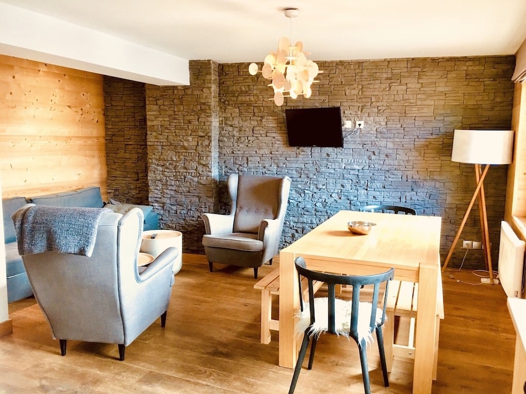 이 평화로운 숙소는 리조트 센터와 가깝고 독립적인 출입구와 공용 녹지 공간을 갖춘 아름다운 전용 테라스를 갖추고 있어 슬로프 근처에서 온 가족이 편안하게 머물 수 있습니다. 주의: 시트, 수건 및 타월이 제공되지 않으며 청소 패키지를 이용할 수 없습니다. 아파트는 소금, 후추, 설탕, 기름, 식기 세척 제품, 세탁기 캡슐, 스폰지, 청소 제품 등 시설이 매우 잘 갖춰져 있습니다. 코딩된 전자 잠금 장치를 통해 셀프 체크인 및 체크아웃.