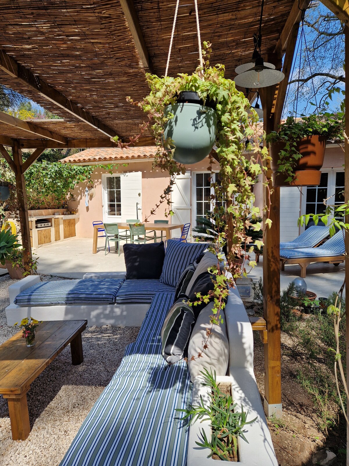 Avec une situation rare et exceptionnelle, la mer à 200 mètres et les sentiers du littoral au pied de la maison, notre cabanon vous accueille dans la pinède de la calanque de Port d'Alon, site unique protégé et classé par le conservatoire du littoral. Votre séjour pourra varier entre baignades, snorkeling, randonnées en bord de mer ou dans les vignes, canoé, golf, pétanque, découverte des villages ou villes vivantes et bucoliques (Le Castellet, Bandol, Sanary sur Mer, Saint Cyr sur Mer).