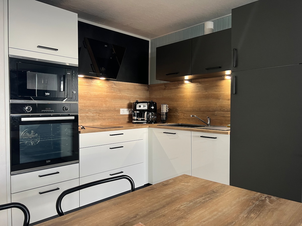 Studio sans prรฉtention via escalier colimaรงon extรฉrieur, au 1er รฉtage d'un hotel rรฉnovรฉe. Arrivรฉe autonome, entrรฉe indรฉpendante, DRAPS ET SERVIETTES FOURNIS (et couette et oreillers). Idรฉal pour faire le tour du parc des volcans d'Auvergne en logeant dans un village calme. Climatisation, Lit SIMBA 2x2m, TV LG OLED 55", petit rรฉfrigรฉrateur-congรฉlateur, micro-ondes, รฉvier, lave vaisselle, DYSON V8. Cafรฉ et thรฉ avec machine ร cafรฉ SENSEO, et bouilloire. Salle de bain, avec WC et lave mains.