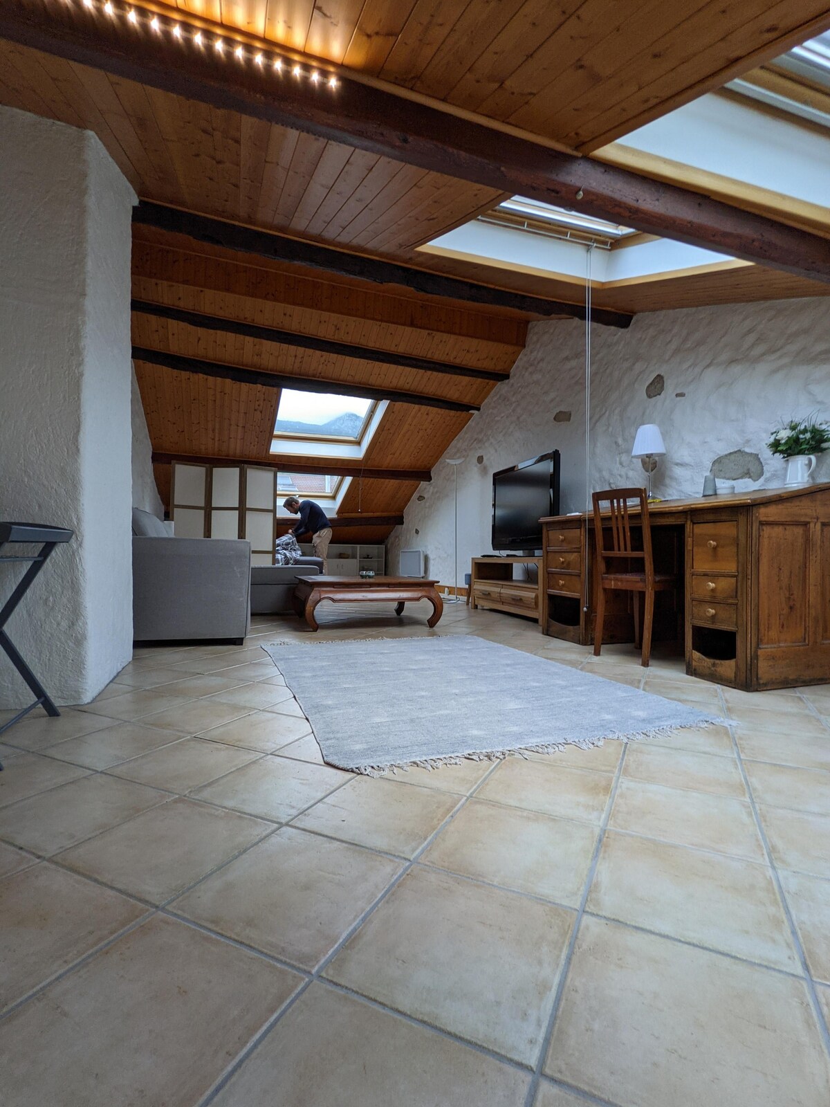 Situé au 1er étage d une batisse familiale au pied du Jura. Mansardé avec belles poutres apparentes Disposé d une chambre avec lit double, d une grande armoire, télévision et Chromecast. Salle de bain, baignoire, toilettes, et machine à laver. Serviettes de bain, couettes, housse de couettes, oreillers, taies d oreillers fournis. Cuisine équipée ouverte sur le salon avec CANAPE LIT 2 PLACES confortable, télé écran plat et Netflix. A 20 mns de Genéve. A 5mns de commerces et une pharmacie.
