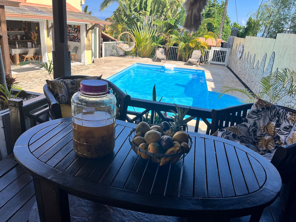 수영장이 있는 메인 빌라에서 독립적으로 출입할 수 있는 방갈로로, 남부 자연과 가까운 독특한 환경에 위치하고 있으며, 바다 전망을 자랑하며 모든 편의 시설에 가깝습니다. 그랑 앙스 해변에서 5분, 생 피에르에서 15분 거리에 있습니다. 최대 3명의 여행객을 위한 침구가 구비된 다락방 침실로 구성되어 있습니다. 1층에는 간이 주방, 욕실, TV 코너, 인터넷 접속이 갖춰져 있습니다. 숙박 기간 중 수영장을 이용하실 수 있습니다.