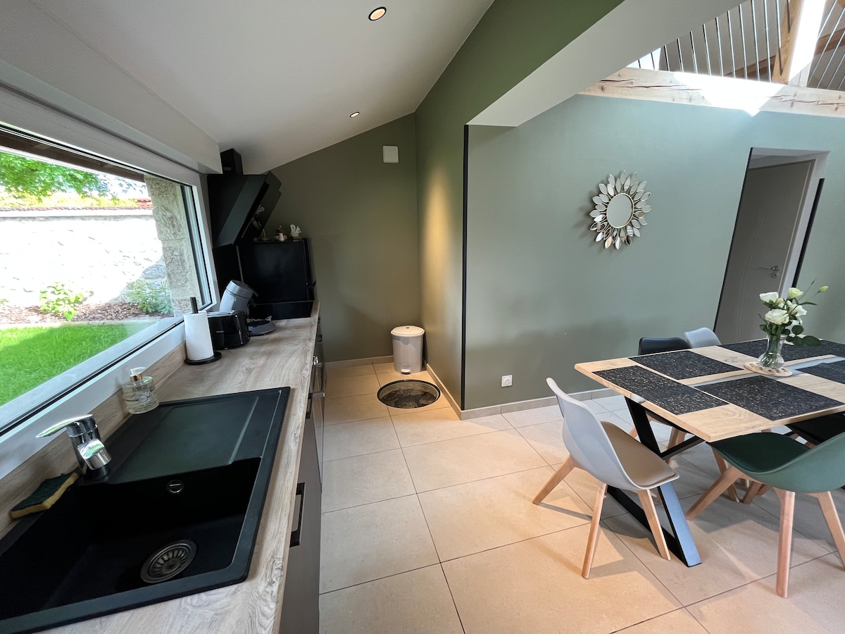 개조된 18세기 농가에서 낭만적인 휴가를 즐겨보세요. 산의 파노라마 전망을 감상할 수 있는 따뜻한 스튜디오, 전용 자쿠지 및 사우나, 비스-아-비스. 🌹 샴페인, 꽃, 꽃잎을 제공하여 저녁을 더욱 풍성하게 만들어드립니다. 바비큐 시설이 있는 아늑한 야외 공간, 레스토랑 및 강에서 5분. 📍생테티엔 35분, 이생조 10분, 르퓌이 30분, 히말라야 산책로 10분.