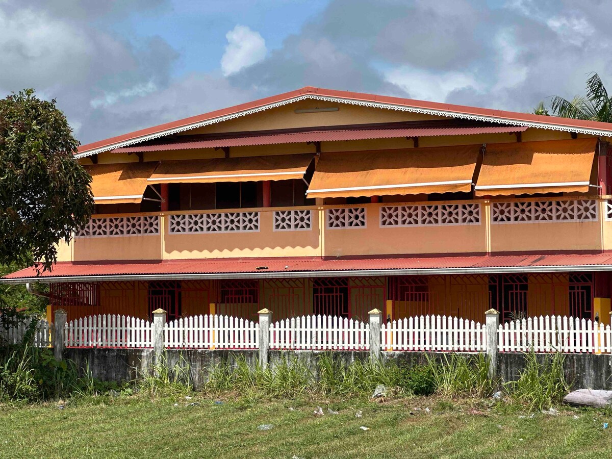 A seulement 4 minutes à pied du Maroni et du centre de Saint Laurent, venez vous détendre sous un carbet amérindien. Vous pourrez accrocher votre hamac et déguster un café de qualité offert avec plaisir. A l'intérieur de la maison entièrement climatisée, vous disposez de tout le nécessaire pour vous préparer un bon repas. Pour la soirée, détendez-vous en regardant votre série préférée sur Netflix. Une literie de qualité vous accueillera pour une nuit de douceur.