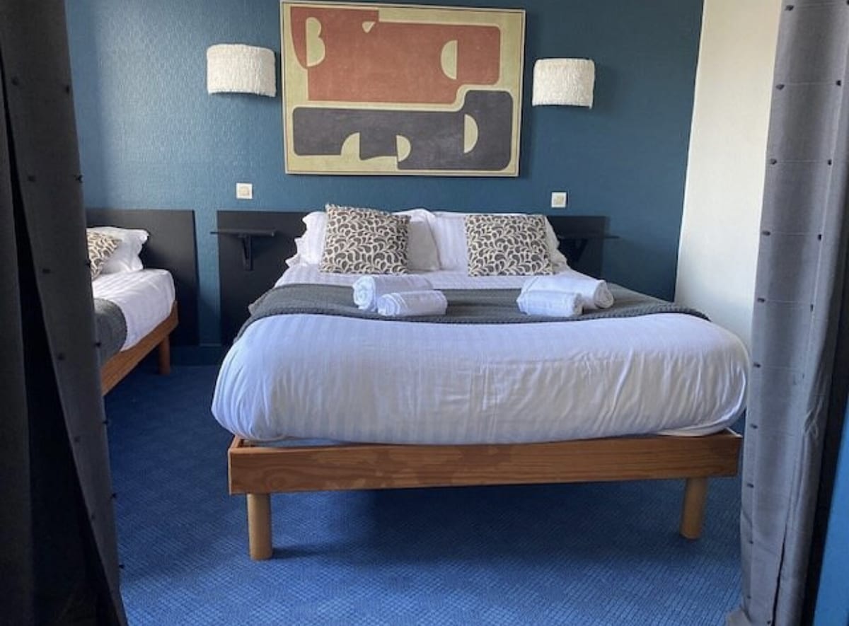 Dans le bâtiment principal de l'hôtel Arvor, ce duplex de 50 m² offre tout l’espace nécessaire pour accueillir jusqu’à 6 personnes. Il se compose de deux chambres, l’une avec un lit king size, l’autre avec 2 lits + 1 canapé convertible 2 personnes.