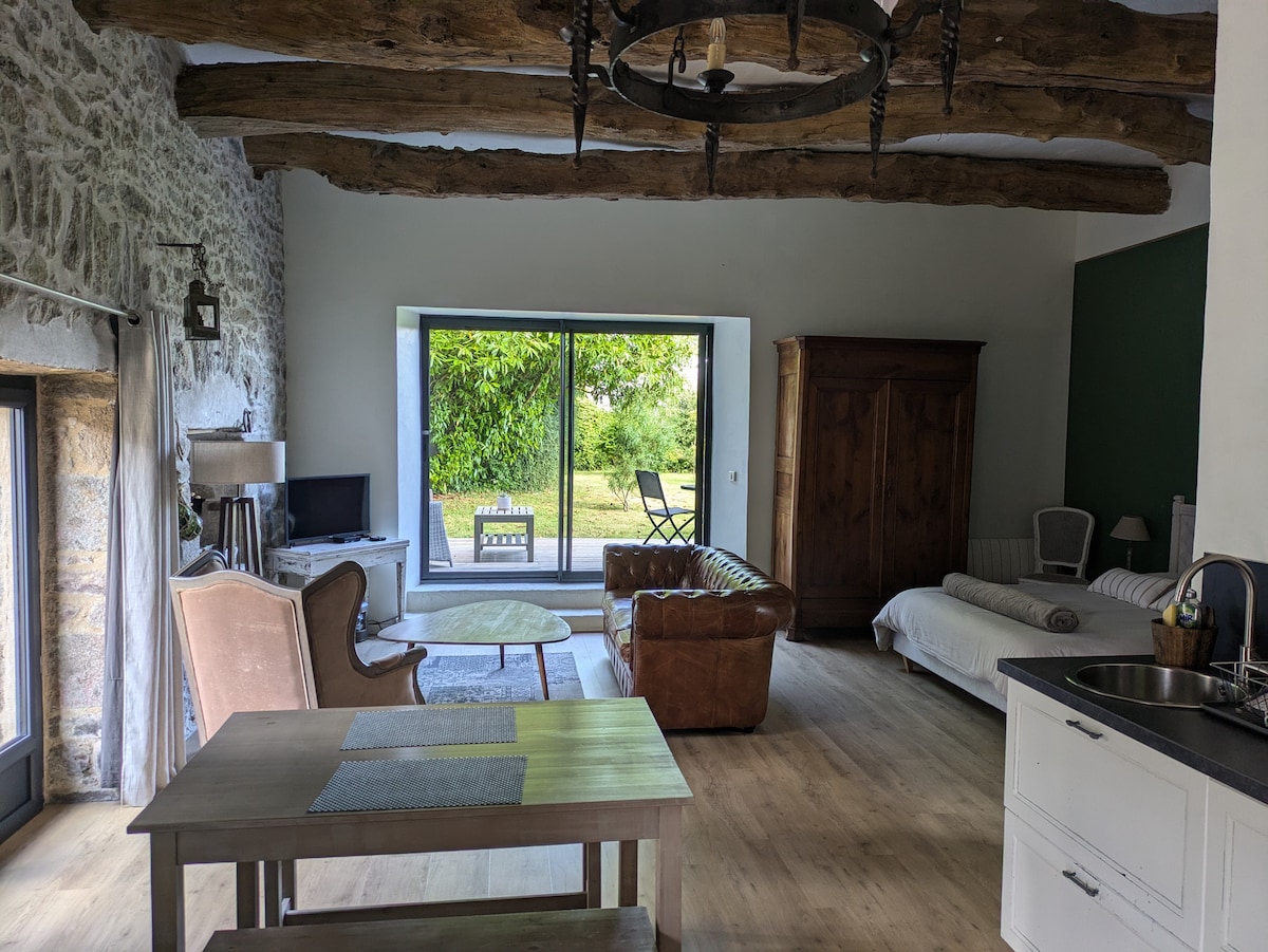 Chambre de 20m2 dans l’extension de ma maison totalement indépendante, avec TV,douche à l’italienne et accès direct sur le jardin et la terrasse. Lit 160 cms. Votre WC est séparé et privatif Parking privé. Espace privé équipé: Nespresso, bouilloire, micro ondes, réfrigérateur, grille pain, PAS DE PLAQUES DE CUISSON Le logement est à 10min à pied du centre et du port de Cancale. A 15 km de St Malo, 40 kms du Mt St Michel. Draps et linge de toilette compris. Draps de plage non fourni