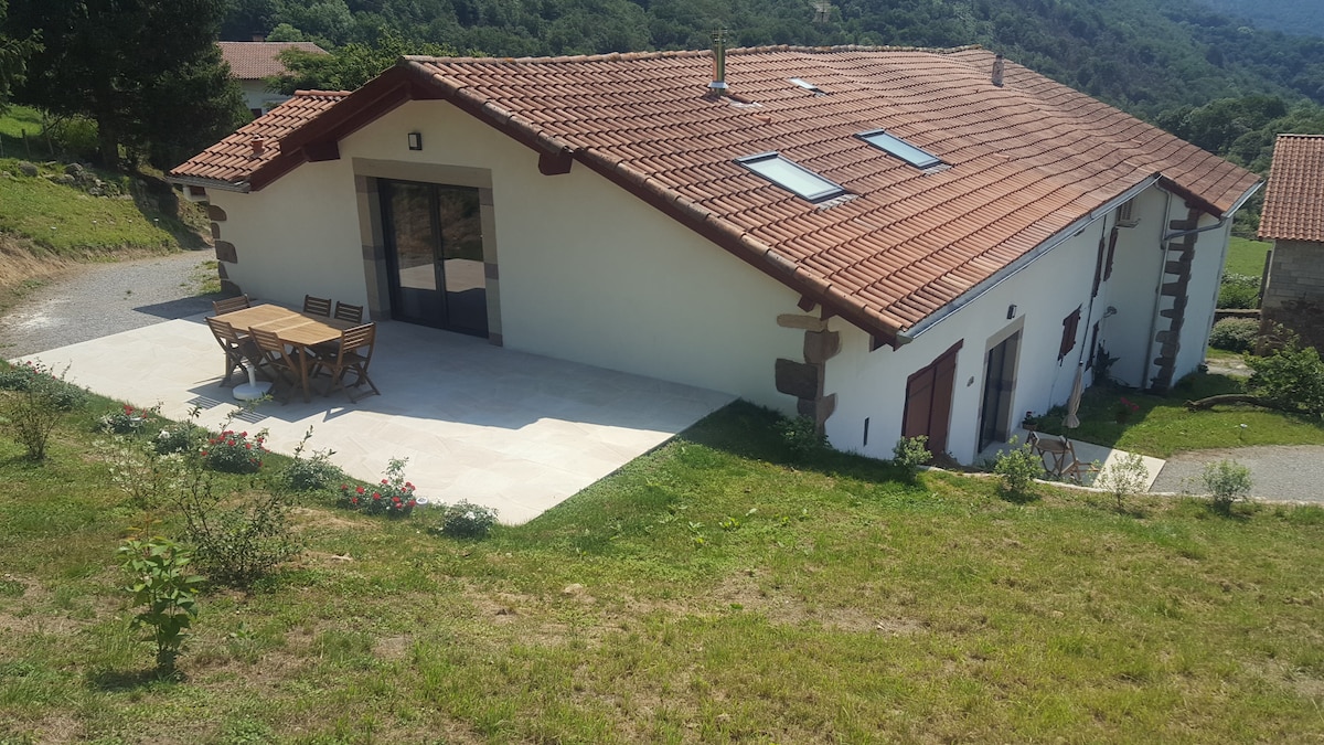 Le gîte Ibarrondoa est un beau gîte lumineux de 150 m2 entièrement fait à neuf dans l'ancien fenil d'une ferme basque traditionnelle. Vous profiterez d'une cuisine tout équipée ouverte sur une vaste pièce de vie lumineuse avec sa grande table familiale et son salon confortable, dans un décor mêlant meubles anciens et confort moderne. Une belle terrasse de 30 m2 donnant sur la montagne et les prés alentours, sans vis à vis, vous offrira des moments conviviaux autour de la plancha.