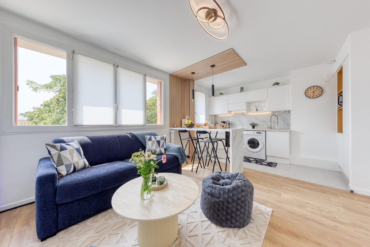 Welcome to this beautiful, brand-new apartment, nestled in a peaceful residential neighborhood, perfect for a relaxing getaway near Paris. This modern retreat features a fully equipped open kitchen and a bright living room with a comfortable sofa bed and a smart TV. The bedroom, with a high-quality double bed, ensures restful nights, while the spacious bathroom offers a relaxing space after your days of exploration.