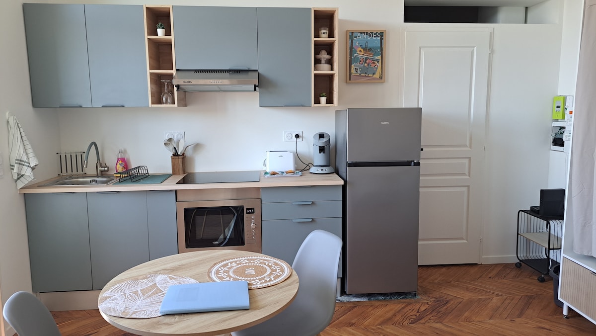 Studio calme de 26m² pour 2 adultes et 1 enfant. À 2 pas des commerces, du lac de Christus et des thermes. En cure, en déplacement pro (wifi fibre) ou en escapade landaise, vous apprécierez le confort, la tranquillité et la fonctionnalité de ce logement. 7mn de la gare de Dax en voiture. Proche voie rapide pour la côte landaise et Bayonne. Commerces et supermarchés à moins de 10mn à pied. Une place de stationnement privé. Les draps et serviettes sont fournis. Les animaux sont les bienvenus.