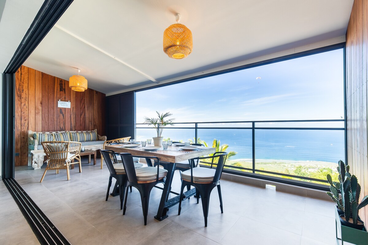 La Suite Cosy & Chic, permet d'accueillir entre 4 à 6 personnes maximum. Elle se compose de deux chambres climatisés, d'un canapé convertible en lit dans le salon . Elle se situe dans l'ouest , au dernier étage de notre résidence, vue mer panoramique à180°, de la plage de l'étang salé et vue sur la route des tamarins. Idéale pour les amis, les grandes familles ,avec sa belle terrasse ,son coin salon à l 'extérieur, pour apprécier ses petits déjeuners et ses magnifiques coucher du soleil