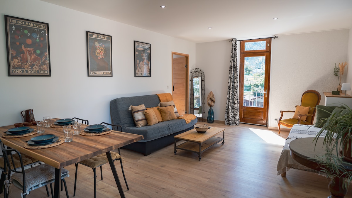 C'est situé dans l'ancienne ferme magnifique du 18e siecle. C'est un gîte très calme de 50m2, complètement autonome ; Vous disposez aussi d'un espace sous une tonnelle pour déjeuner dehors. La piscine vous est accessible, dans un magnifique jardin avec vue sur le Vercors. Des ballades à pieds en sortant et sur le Vercors à 10 mn. Centre village à quelques minutes et gare tgv à 15mn.