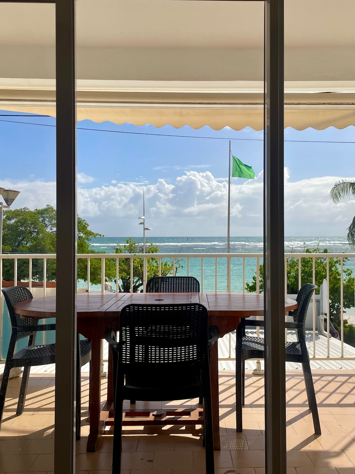 T2 climatisé les pieds dans l’eau à Sainte-Anne, avec accès direct au lagon et à la plage, terrasse en bois (deck) et jardin tropical. Cuisine ouverte avec vue sur la mer, barbecue et douche solaire, pour savourer des instants de pur bonheur face à l’eau turquoise, au rythme des alizés.