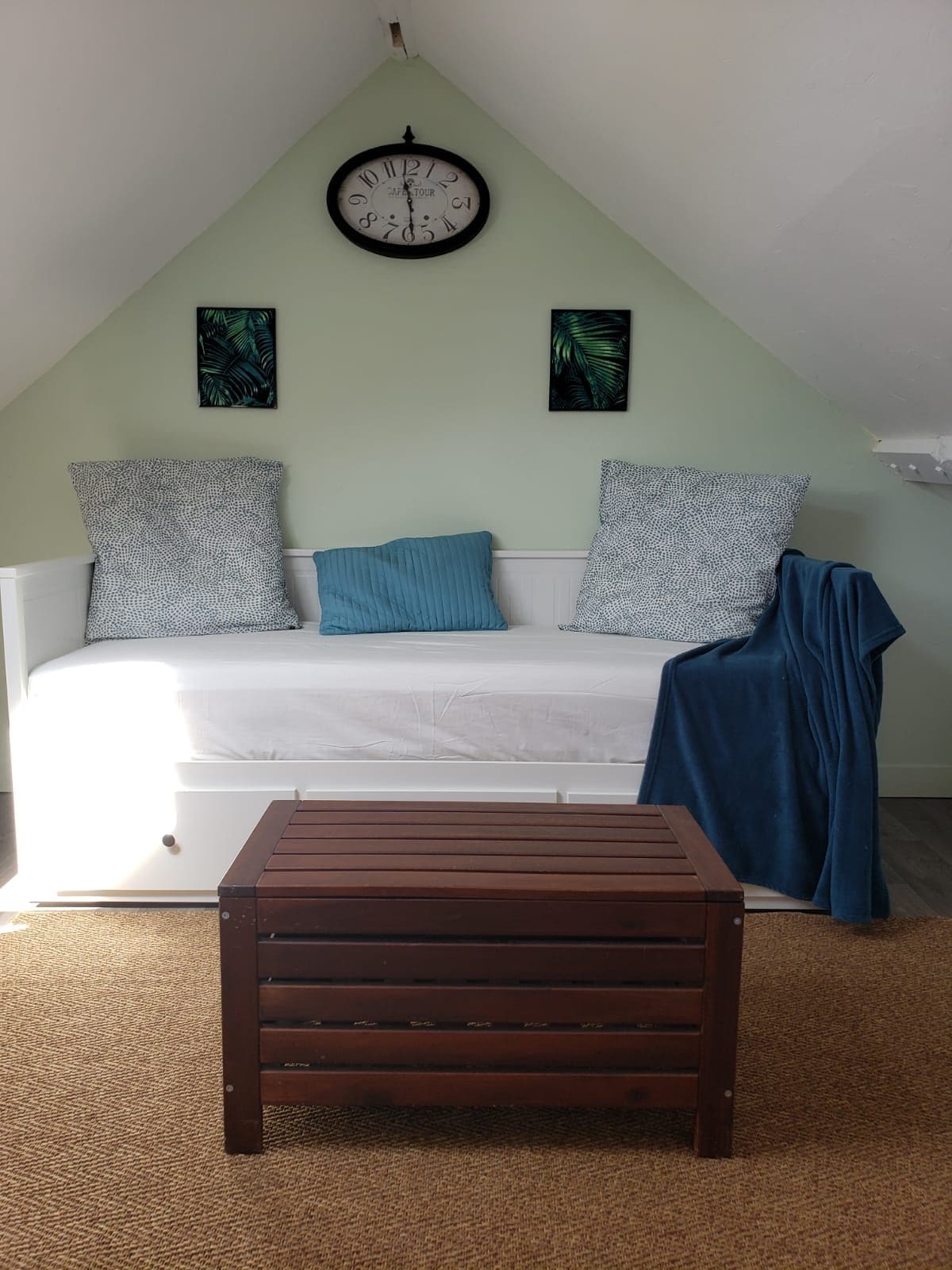Proche McArthurGlen Paris-Giverny; Giverny (ouvert avr-oct), Roche Guyon, Château Gaillard, cadre calme et verdoyant, gîte équipé d'une chambre avec un lit double (et un matelas au sol), une douche & WC + cuisine équipée (frigo, four, micro-onde, vaisselle), idéal pour famille (couple avec 1 enfant). Balades à pied / à vélo. Situé 1 heure de Paris (accessible en train via Vernon, puis Uber / location de voiture, 10 mins - à réserver en avance). Accès partagé au parking et jardin paysagé.