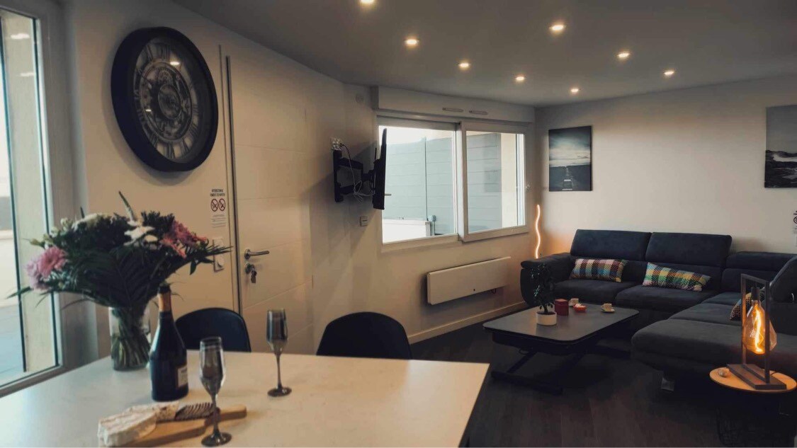 Dominant la mer, le logement dévoile un panorama spectaculaire. Derrière une grande baie vitrée, le salon, la cuisine et la chambre ouverte offrent un spectacle permanent au rythme des marées, des levers et des couchers de soleil. C’est l’endroit idéal pour se retrouver, vibrer, célébrer l’instant présent et créer des souvenirs inoubliables, comme une demande en mariage face à l’océan.