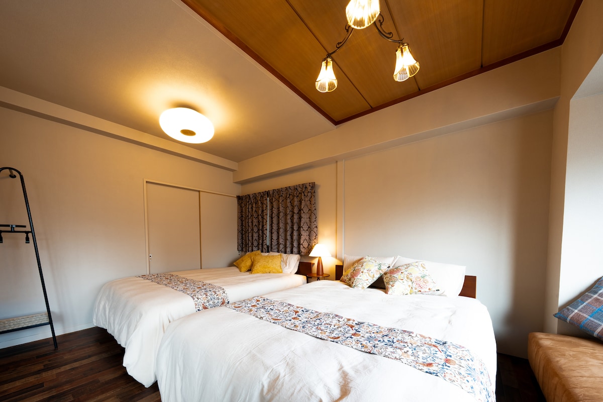 가족이 함께 즐기는 비일상적인 패밀리 스테이. 2019년 준공된 건물의 최상층 10층에 위치한 객실로, 넓고 편안한 공간과 세련된 인테리어가 여행지의 거실 같은 분위기를 제공합니다. 드럼식 세탁건조기가 설치되어 있어 세탁부터 건조까지 한 대로 모두 가능합니다, 가족 및 연박에 적합합니다. 어린이를 위한 장난감이 준비되어 있으며, 도보 1분 거리의 마쓰바라 공원에서 축구공으로 야외 놀이도 가능합니다. 2~6세용 어린이 좌석 자전거 2대 이용 가능. 바로 옆에 인기 음식점이 있으며, 오전 8시부터 운영하는 카페 유니콘의 모닝 샌드위치가 유명합니다. 오스칸논 역 도보 10분, 오스 상점가 도보 11분. 더블 침대 2개를 나란히 배치해 아이도 안전합니다.