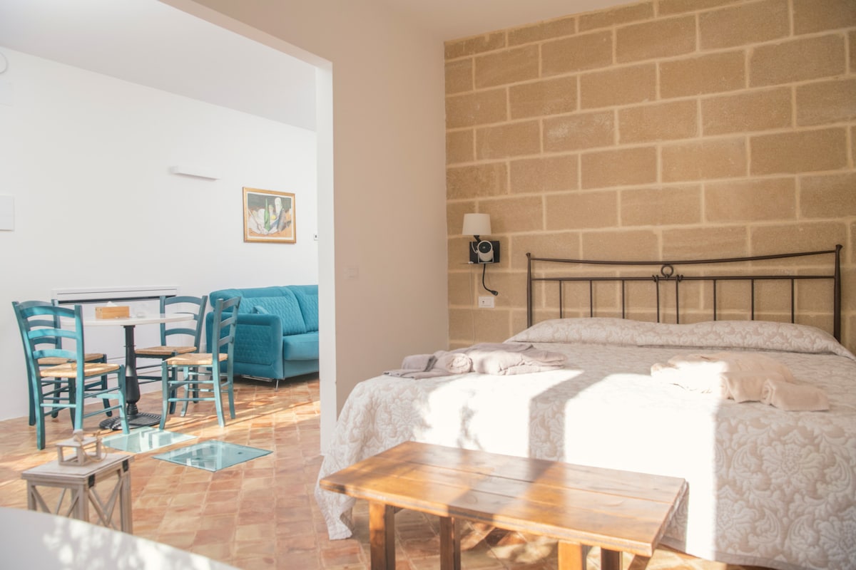 La Stanza del Portico is a spacious ground-floor studio, ideal for 2–4 people, just 800 m from the sea. It features a double bed, sofa bed, kitchenette, private bathroom, TV, Wi-Fi, air conditioning. Outside, a small garden with table, chairs and barbecue is available. Also available Wallbox for electric car charging. Quiet area, close to beaches and services. Perfect for couples, families or friends.