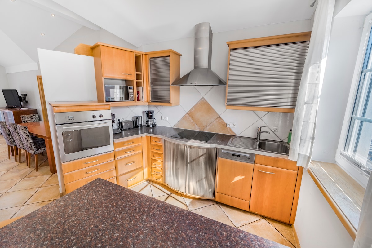 넓은 테라스가 있는 일류 시설을 갖춘 펜트하우스는 120평방미터의 침실 4개, 로프트 디자인의 멋진 거실, 식사 공간이 있는 주방, 욕실과 별도의 화장실, 호헨 잘츠부르크 요새, 도시 산, 가이스버그의 전망을 감상할 수 있는 훌륭한 일광욕 테라스를 제공합니다.