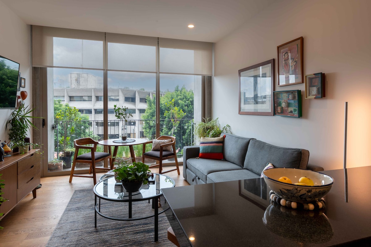 코요아칸의 예술적 중심지인 프리다 칼로 박물관에서 두 블록 떨어진 아름다운 럭셔리 아파트입니다. 킹사이즈 침대와 더블 침대가 있는 침실 2개가 있습니다. 욕실, 4인용 거실, 완비된 주방, 식사 공간 및 전용 테라스가 있습니다. 50mnbs 인터넷이 갖춰져 있습니다. 프리다 칼로 박물관, 비베로스 데 코요아칸, 공예 시장, 코요아칸 교회, 국립 시네테카, 상점과 레스토랑에서 가깝습니다.