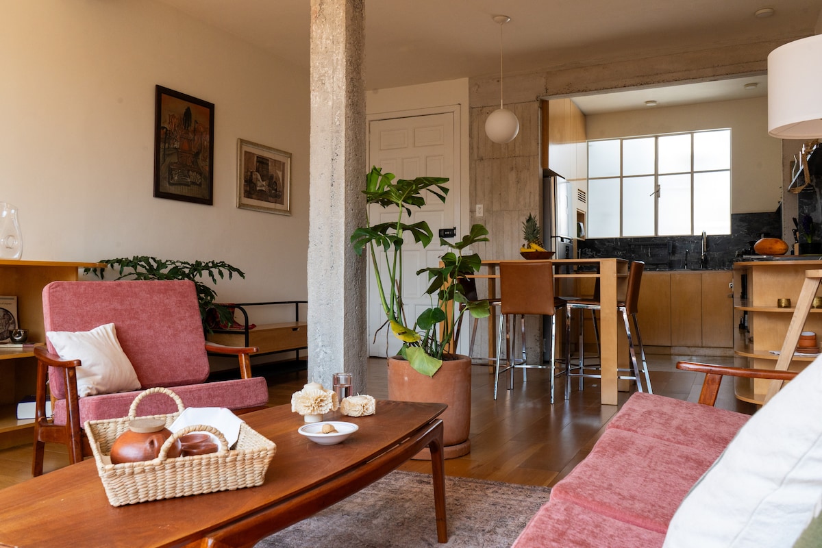 ¡Bienvenidos a Coyoacán! Estupendo loft de 120 m2 ubicado a tan solo 5 minutos caminando del Centro de Coyoacán. Vive la experiencia de este tranquilo e iluminado espacio abierto, ideal para descansar o trabajar y decorado con objetos llenos de historias. El loft se encuentra en el tercer piso de Casa Mavi, una antigua fábrica que fue remodelada para crear un lugar lleno de encanto que lo hace único. Cuenta con terrazas de uso común. Con opción para un tercer huésped. Wifi 200 megas.