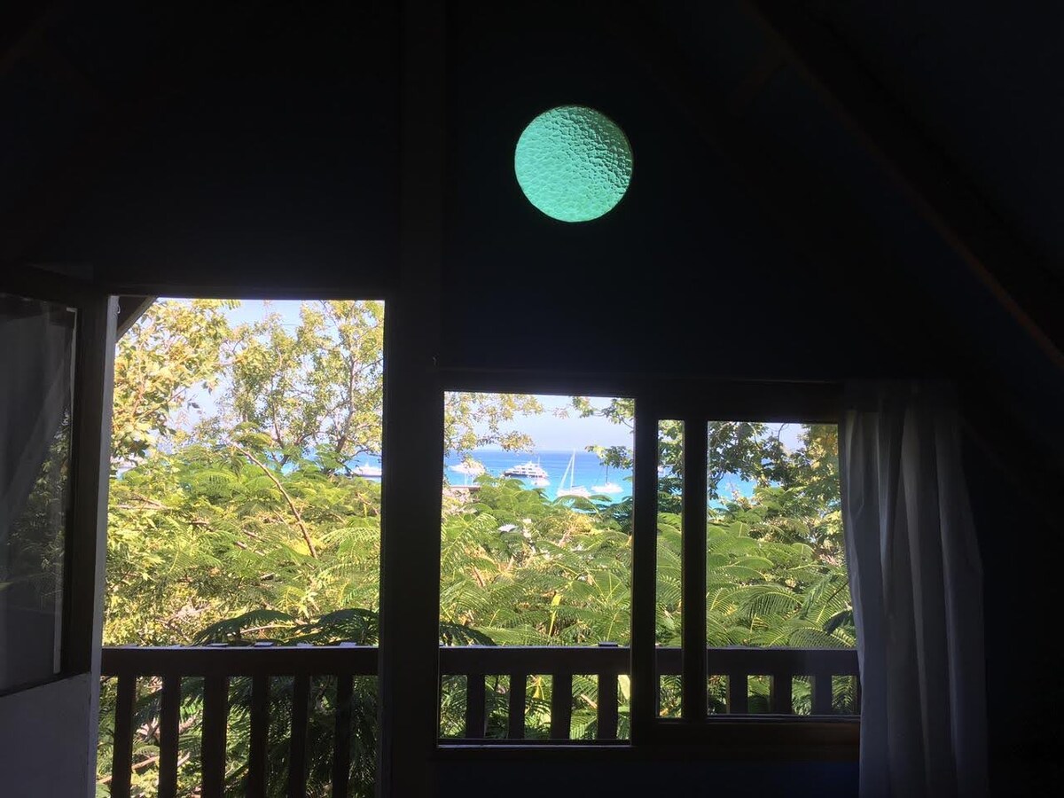 Un lugar tranquilo a solo unos pasos de la Playa Mann y de otros atractivos naturales turisticos de la zona. Ubicado en una zona tranquila de Puerto Baquerizo Moreno. Es una habitación amplia con balcon vista al mar, ubicada en el altillo de una Cabaña, con acceso por escaleras internas a la cabaña. Cabaña equipada con cocina, refrigerador, horno eléctrico y todo lo necesario para hacer tu estadía independiente. Acceso a espacios comunes externos con asientos y hamacas.