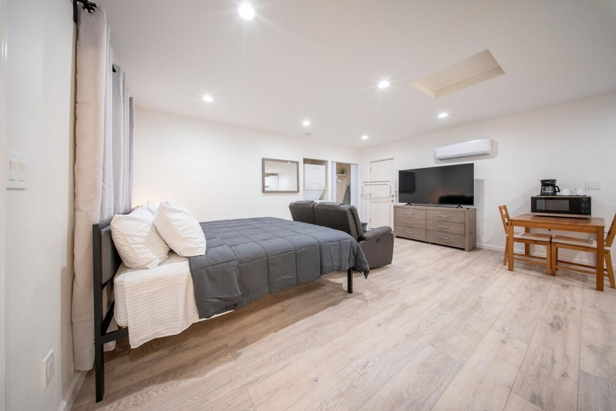 이스트 스위트: 580평방 피트 2룸 스위트, 열쇠 없는 출입, 별도의 거실, 침실, 장기 숙박에 적합합니다! 최근에 리모델링한 숙소로 편의시설이 많고, 새 가구, 우아한 인테리어, 넓고 편안한 공간, 고속 와이파이가 갖춰져 있습니다. 모든 가전제품, 정수된 식수 수도꼭지, 기본적인 조리를 위한 모든 필수품이 갖춰진 간이 주방. 고급 호텔 품질의 침구가 구비된 퀸사이즈 침대. 안전한 게이트 주차장. LA 카운티, 남부 캘리포니아의 모든 것에 가깝습니다. 두 번째 인접 스위트 룸을 이용할 수 있습니다. 월 단위 숙박 가능합니다.