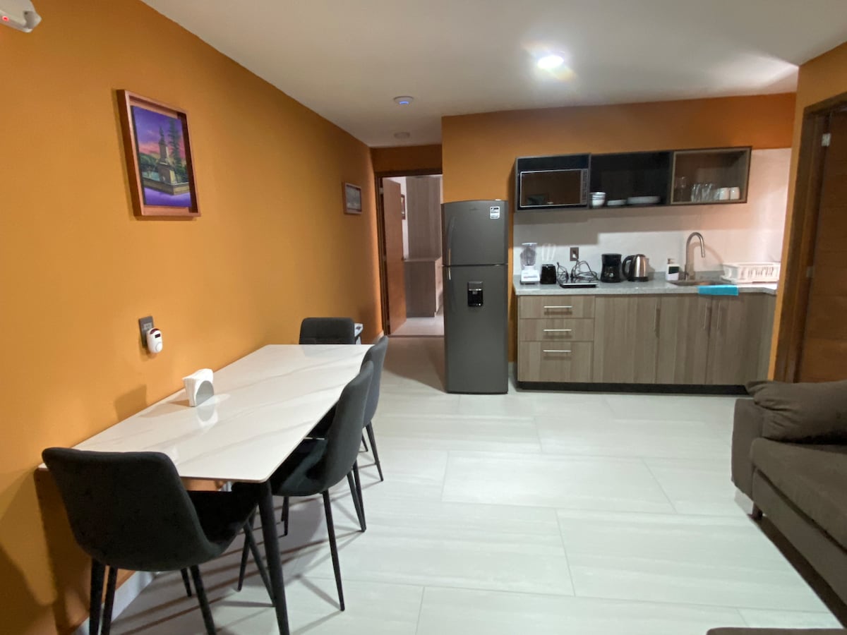 Beautiful suite Boutique concept furnished with antique touch but fully equipped. Heart of the historic center. Beautiful apartment located on pedestrian street in the best location in downtown w/ amazing private rooftop terrace. The apartment sleeps 2 people is fully equipped with private bathroom, kitchen and dining area. Walking distance to everywhere in downtown Queretaro. The place is clean quiet and full of design. Nice terrace Safe box Bathroom Queen size bed Dining room Living room 49
