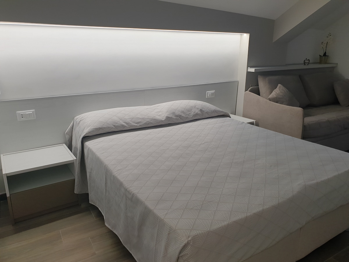 Ampia e confortevole stanza con colazione in camera nata dall'esperienza dei nostri viaggi è stata progettata per essere il più possibile comoda e funzionale, di fatti è composta da: spazio esterno con veranda, camera da letto con spazio di lavoro dedicato e un angolo adibito al consumo di eventuali pasti d'asporto e Tv42" con Netflix incluso, corridoio con armadio e 2 poggia valigie, ampio bagno completo con doppio lavabo e doccia. Dalla veranda, dove è presente un accogliente salottino adatto anche per fumare, si accede alla camera da letto. La camera può essere allestita con un letto matrimoniale o con due letti singoli, a seconda delle preferenze degli ospiti. Troverete una TV con Netflix incluso, connessione Wi-Fi, carica batterie wireless e presa USB-C. Inoltre, è a disposizione il frigo bar e un bollitore per preparare tè e infusi. La macchina del caffè è in grado di fare anche cappuccini. Proseguendo lungo il corridoio, gli ospiti troveranno un ampio armadio e 2 comodi poggia valigie. Infine, il bagno completo con doccia e doppio lavabo, oltre a un kit di cortesia e asciugamani inclusi. Il phon è a disposizione per gli ospiti. La colazione verrà servita in camera al mattino, in base all’ordine depositato la sera precedente.