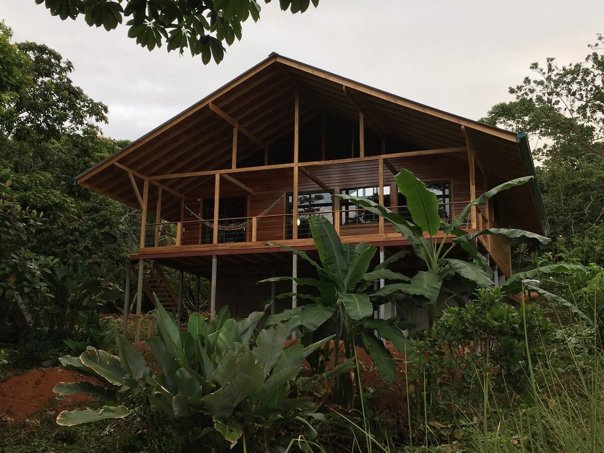 Enjoy Pura Vida in a brand-new unique bamboo eco-lodge. Large well-ventilated bedroom with king bed and gorgeous mezzanine with queen bed. Experience the open-air bathroom overlooking nature. Observe toucans and monkeys in the jungle from the spacious private balcony while relaxing in a hammock. Practice yoga on a private bamboo yoga platform while admiring the view of the ocean in the background. Walk the private trail to the waterfall on the property for a swim and relax in the sun in privacy.