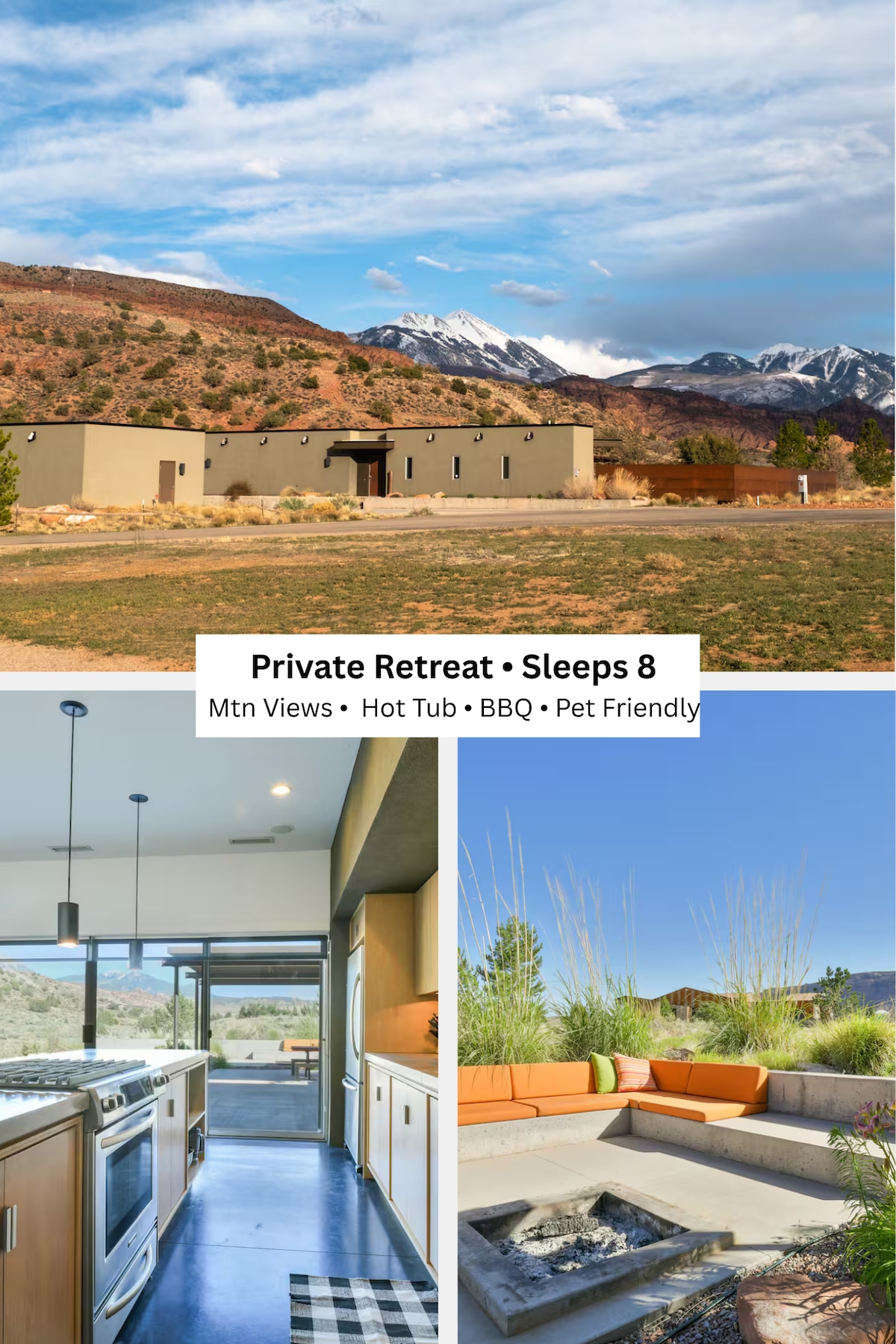 Unwind in contemporary style on the edge of public land with unobstructed La Sal Mountain views. Walk private trails to the lake and nearby petroglyphs, then soak in the hot tub or gather around the fire pit. Every bedroom opens to the patio, blending indoor comfort with desert air in this design-forward retreat.