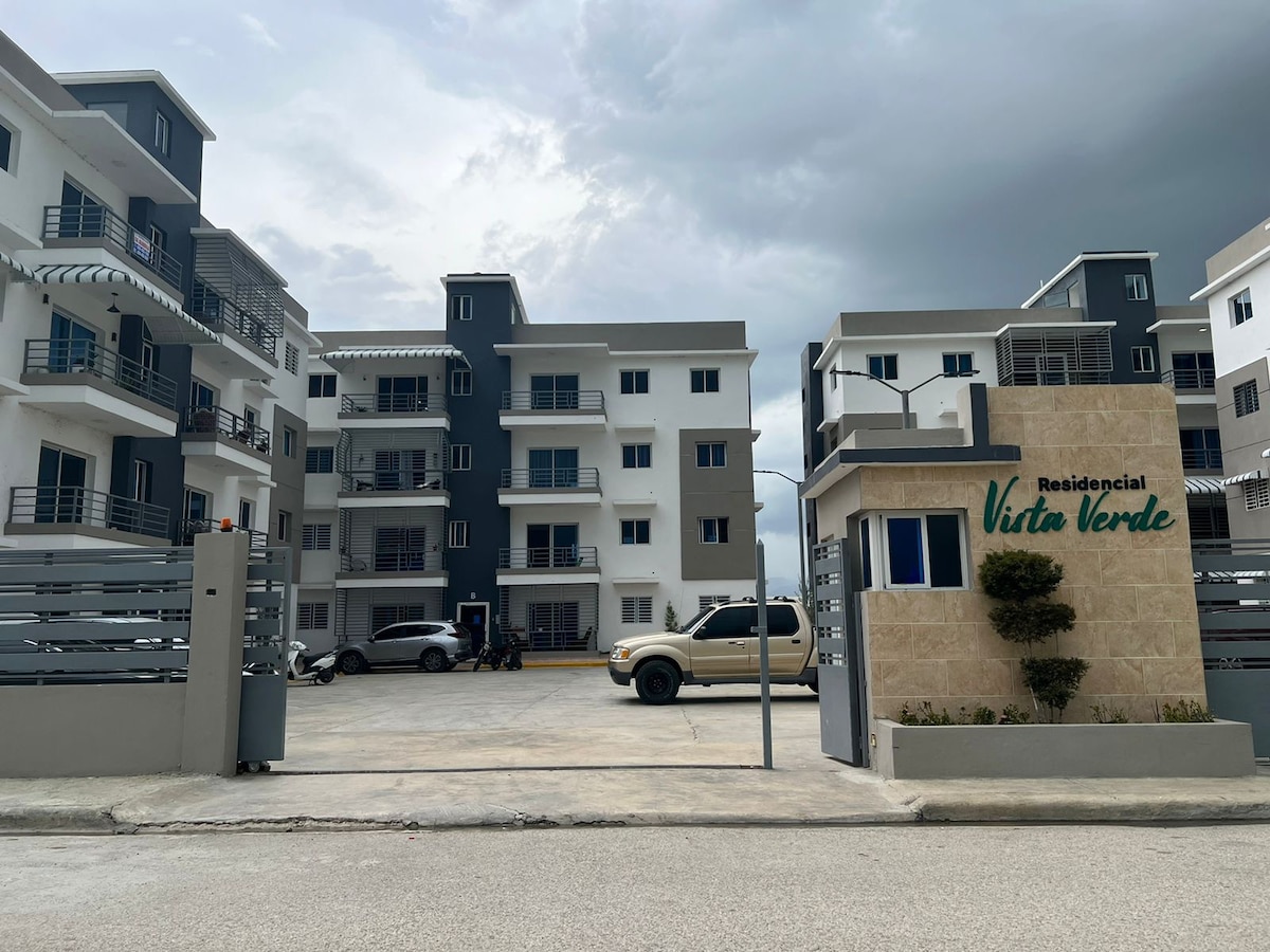 Central apartment with a view of the Cordillera. With WI-FI, Smart TV, Air Conditioning, Water Heater, Fully equipped kitchen with stove, refrigerator, blender, electric coffee maker, Air Fryer and all the necessary utensils. Comfortable, spacious and cool! Ideal for Groups - Family - Work - Rest - Ecological Adventures (routes to Pico Duarte, hiking, etc.). 100 meters from the Sports Stadium and 50 meters. supermarket, store, hardware store, pharmacy...