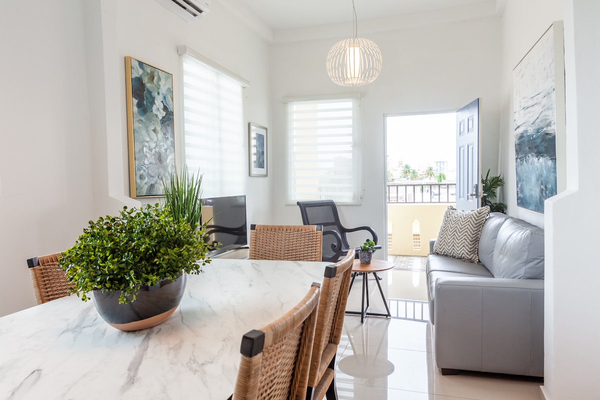 SJU 공항에서 차로 7분 거리에 있는 이 중심부에 위치한 숙소에서 세련된 경험을 즐겨보세요. 해변, 패시브 파크, 헬스장, 수영장, 그릴 공간, 농구 코트, 테니스 코트, 1층의 "라운드맷"으로 바로 가실 수 있습니다. 해변과 도시의 전망을 감상할 수 있는 아늑한 전원 스타일의 현대적인 발코니에 있는 흔들 의자에서 커피나 와인을 마시며 즐거운 시간을 보내세요. @buenavidabeachstudio 팔로우