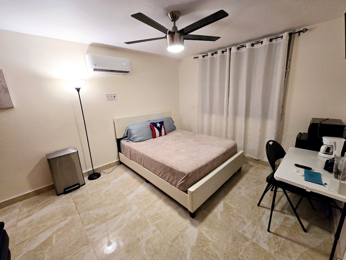 Acogedor apartamento estudio con cama queen, nevera, microondas y baño, ubicado en el centro de la cuidad. Con rápido acceso a centros comerciales, turisticos, y lugares importantes del area metropolitana. A 6 minutos del aeropuerto tomando el puente Teodoro Moscoso. !Excelente lugar para hospedarse y descansar!