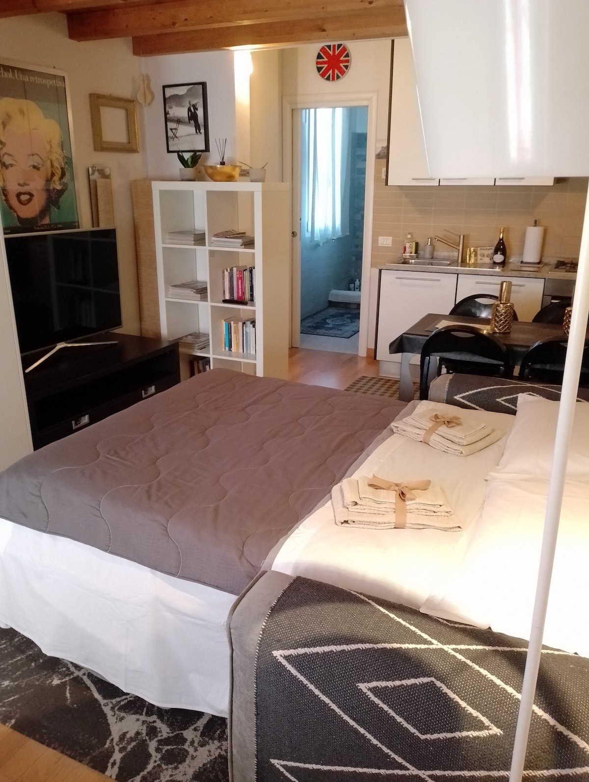 Elegante e silenziosissimo monolocale situato in tipico palazzo nel centro storico bolognese completamente ristrutturato e ammobiliato nel 2020. L'appartamento è composto da ampio e luminoso monolocale con romantico camino in pietra naturale. Dispone di angolo cottura con piano ad induzione e interamente accessoriato. Il bagno è dotato di ampio box doccia e a disposizione degli ospiti è presente una lavatrice. L'appartamento è interamente climatizzato, dotato di Smat TV (40 pollici) e Wi-Fi.