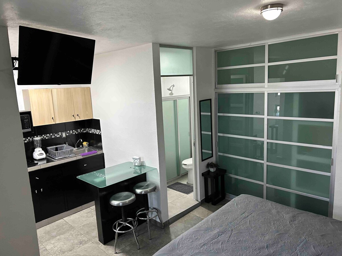 Relájate en este loft tranquilo, elegante y espacioso, en planta baja, cochera con portón eléctrico, chapa digital, entrada autónoma, cómoda cama queen, closet grande, baño amplio, sofá cama, pantalla 55” cocina totalmente equipada, refri, airfryer, etc. Y para trabajar, internet de alta velocidad, y un amplio escritorio. A unos pasos Oxxo y Brotgarten. Caminando a 2 cuadras la ave. Carranza, a unas 4 cuadras muchas opciones: “tacos el pata,”Vips, B. De Obregón, iglesia, Starbucks, gimnasio.