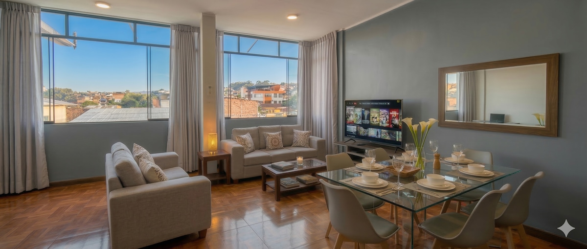 2층에 있는 게스트 전용 아파트, 독립된 출입구, 소파 베드와 평면 스마트 TV가 있는 아늑한 거실, 의자 4개가 있는 테이블, 현대적인 주방, 에어컨, 편안한 침대 2개가 있는 침실 2개, 전용 업무 공간, 욕실 2개, 온수, 실내 테라스, 그릴이 있는 테라스, 세탁기/건조기. 인터넷, 무료 주차장, 공항에서 10분, 플라사 데 아르마스에서 6분 거리에 있습니다. 잊지 못할 경험을 하게 될 거예요.