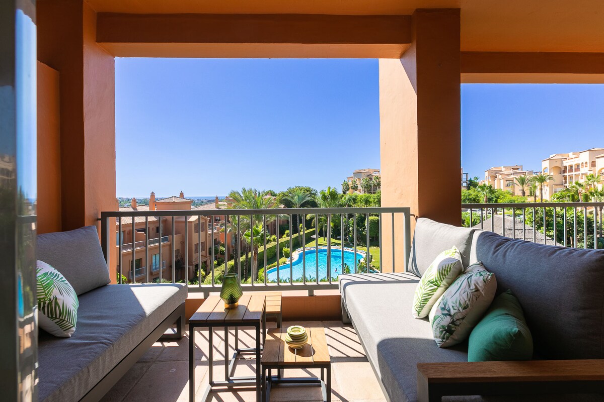 This spacious and bright 60m2 studio has an extra-large double bed, a comfortable italian sofa bed, a furnished terrace, a kitchenette and a private bathroom. In addition, among its equipment, the free Wi-Fi connection, 50" SmartTV, a safe, dressing table and all the details of the kitchen area with crockery, microwave, refrigerator, dishwasher, electric hob and extractor. This modern apartment is located inside a 4 stars Hotel in Puerto Banus which was totally renewed on 2023