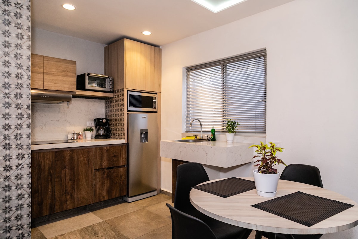 Moderno y funcional departamento de una habitación, ideal para parejas o viajeros que buscan comodidad y practicidad. - Cuenta con cama matrimonial, baño privado, sofa cama, cocina equipada y comedor para 3 personas, ideal para estancias cortas o largas. - Disfruta de internet con 200 megas para mantenerte siempre conectado. - Ubicación estratégica cerca del Consulado americano y la UDEM, en una zona segura y comunicada con opciones de restaurantes, cafés y centros comerciales.