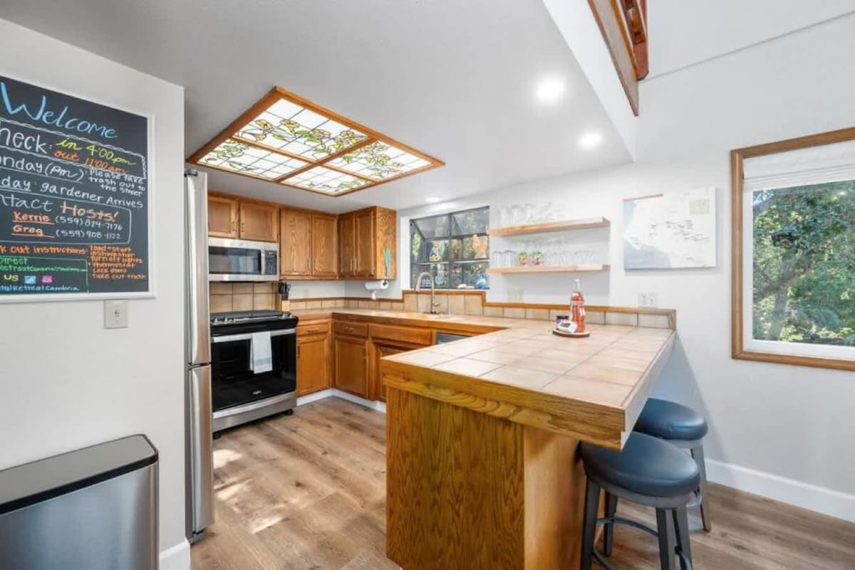 Escape to our Big Sur-style woodland retreat in Cambria! This serene 2-bed, 2-bath home comfortably sleeps 8. Enjoy panoramic forest views from the expansive deck with a fire pit and grill. Inside, find a chef's kitchen, wood-burning fireplace, and vaulted ceilings. Perfect for families or groups seeking a peaceful coastal getaway just minutes from Moonstone Beach and Hearst Castle.