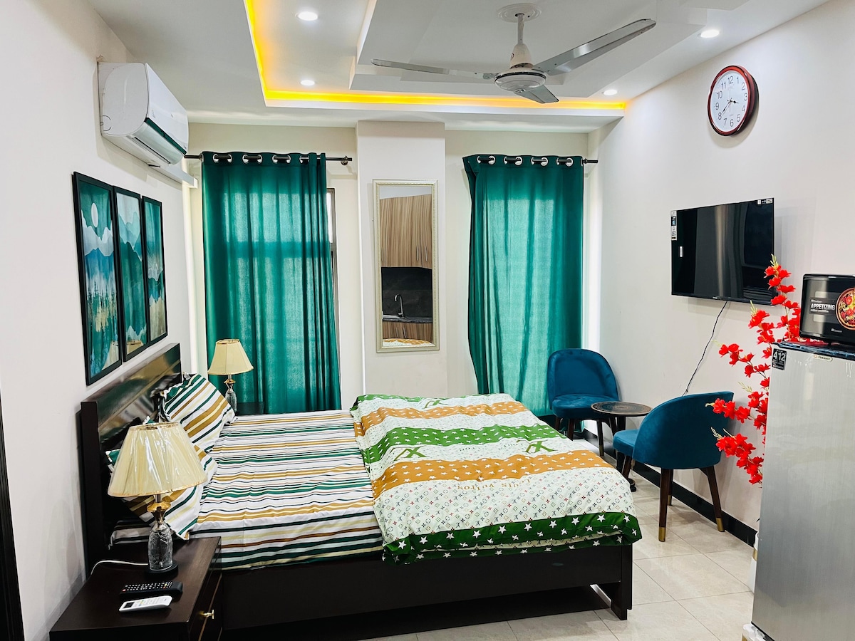 Experience modern comfort and elegance at this designer 1 bedroom apartment in Eleven Heights 3, Bahria Town Phase 8. Enjoy high speed WiFi, a Netflix ready Smart TV, and effortless self check-in. Located in a peaceful gated community with 24/7 security. Just minutes from Giga Mall, Amazon Mall, and Phase 7 Food Street. Perfect for couples, professionals, or long term guests. Your serene escape in Bahria Town awaits, feel at home the moment you arrive.