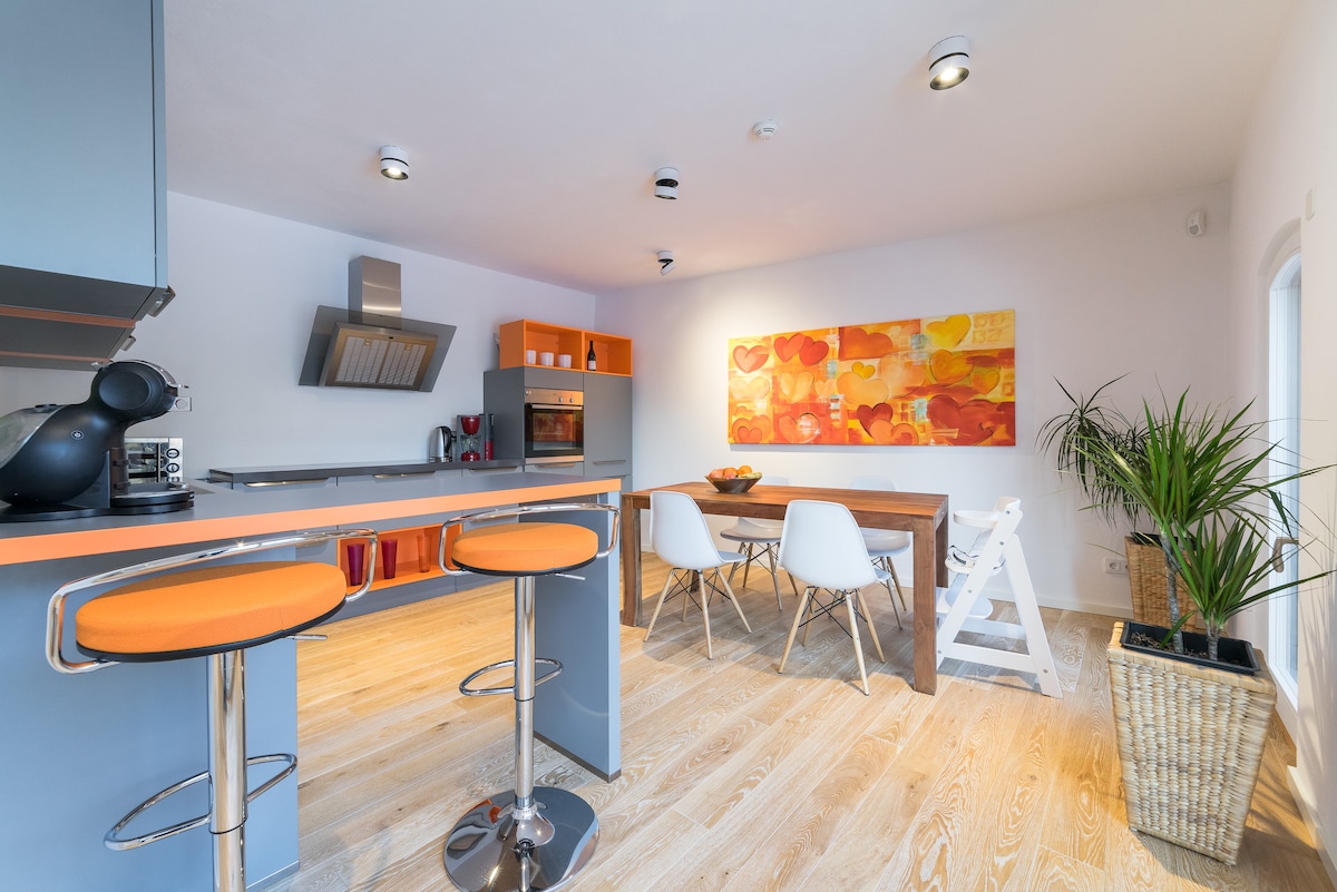 포츠담과 베를린에서 차로 20분, 베를린 공항에서 기차로 30분 거리에 있는 다락방 아파트. 넓고 완비된 디자인 주방*, 아가페 비에케스 욕조와 세면대*, 2.70m 높이의 침대*, 피트니스 룸은 두 번째 수면 공간으로 사용할 수 있습니다. 여기에 1.80m 더블 베드* 넷플릭스, 디즈니 + 및 아마존 프라임 로그인을 위한 앱 사전 설치 프로젝터, 장난감, 베이커와 정육점이 있는 슈퍼마켓, 음료 마켓* 호수 및 하이킹