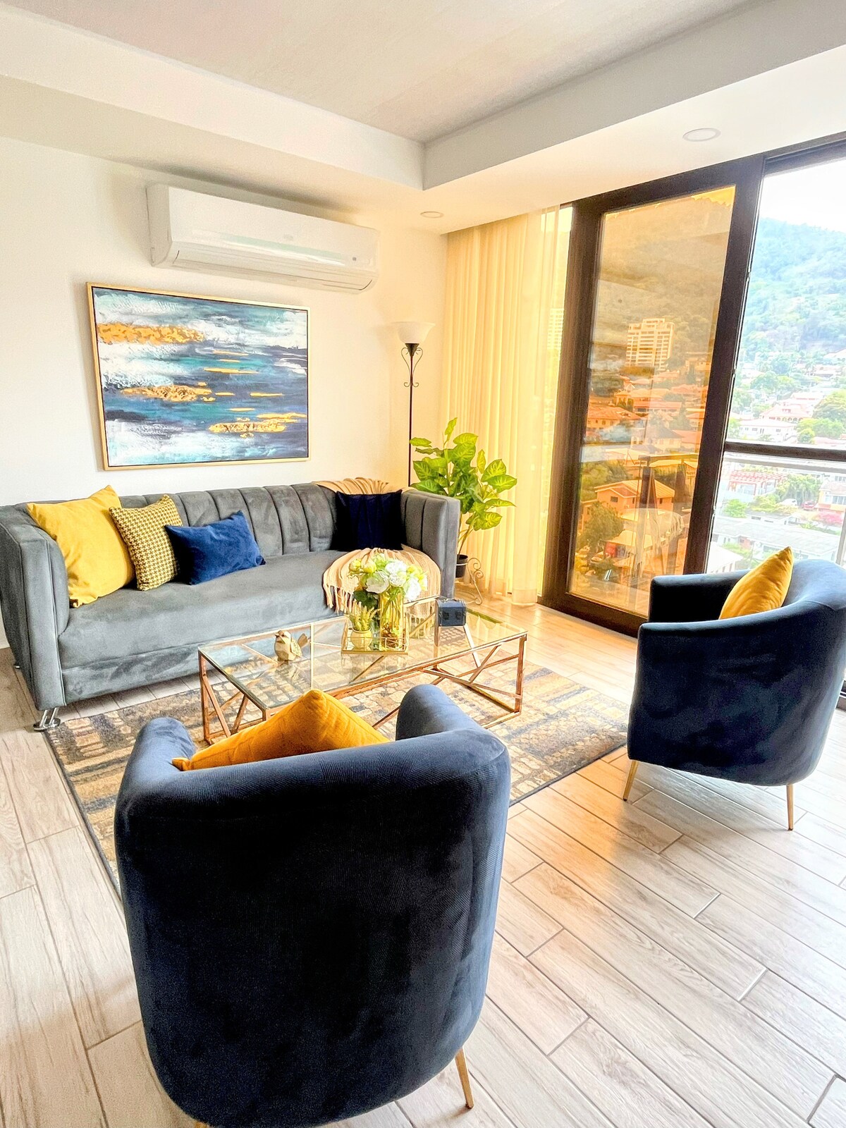 New Apartment, spectacular view of the city, on the 12th floor, located in the center of the city, close to restaurants, supermarkets, 20 minutes from the airport. It has spectacular views of the city and Merendon. Adorned with Lencas details.