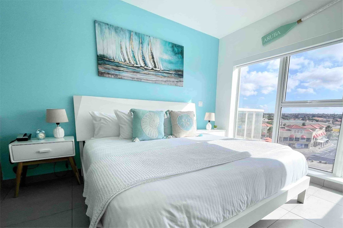 이 아름다운 스튜디오는 아루바의 파란 색을 반영하며 매우 현대적이고 깨끗한 디자인으로 매우 편안한 킹사이즈 침대와 킹사이즈 베개, 완비된 실용적인 주방, 아름다운 워크인 옷장, 스파와 같은 레인폴 샤워기가 있는 현대적인 욕실을 제공합니다. 건물의 가장 높은 층에 위치해 있어 아루바 시내와 항구의 멋진 전망을 자랑합니다! 물과 크루즈선이 내려다보이는 360도 전망과 최첨단 헬스장을 갖춘 인피니티 풀과 옥상 온수 욕조를 즐겨보세요!