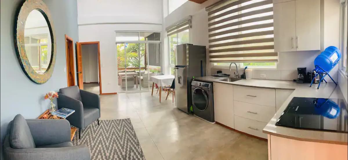 Kick back and relax in this calm, stylish space. A bright and comfortable two-bedroom apartment in the heart of the Galapagos, Santa Cruz Island. Surrounded by vegetation, it is situated only four blocks from the main street, five minutes walk from the main dock, and at the entrance of Tortuga Bay. AMAZING terrace with outside dining areas. Perfect for couples or a small group of friends. It offers working spaces, a kitchen, a washing machine, all you need to have your own home in the Galapagos.