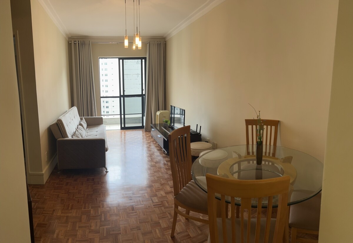 NÃO RESERVE ANTES DE LER TODAS AS REGRAS DA CASA E DESCRIÇÃO DO APARTAMENTO. Nela que você encontrará todas as informações do apartamento. Studio de 32 m2 na melhor localização. Prédio antigo mas apartamento recém reformado. Tudo novinho. Quarto com cama de casal de molas, smart Tv gigante de 65’ espaço para estudo/trabalho ou produzir uma make, guarda roupa espelhado, ar condicionado split quente e frio, banheiro clean e uma mini cozinha para aqueles que procuram preparar refeições rápidas.