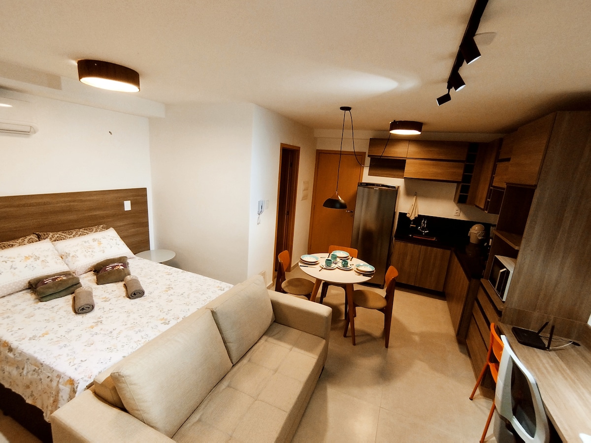 Apartamento super confortável tipo studio com localização imbatível para seus compromissos de trabalho e/ou lazer. ► Cama de casal com colchão de molas; ► Smart Tv 40” (incluso Netflix, Prime Video, Disney+ e Globoplay); ► Ar-condicionado; ► Ventilador turbo; ► Persiana tipo blackout; ► Roupeiro com cabides; ► Caixinha de som bluetooth; ► Mesa de estudos/trabalho com luminária; ► Sofá-cama para casal; ► Mesa para alimentação; ► Cozinha equipada para preparar pequenas refeições.